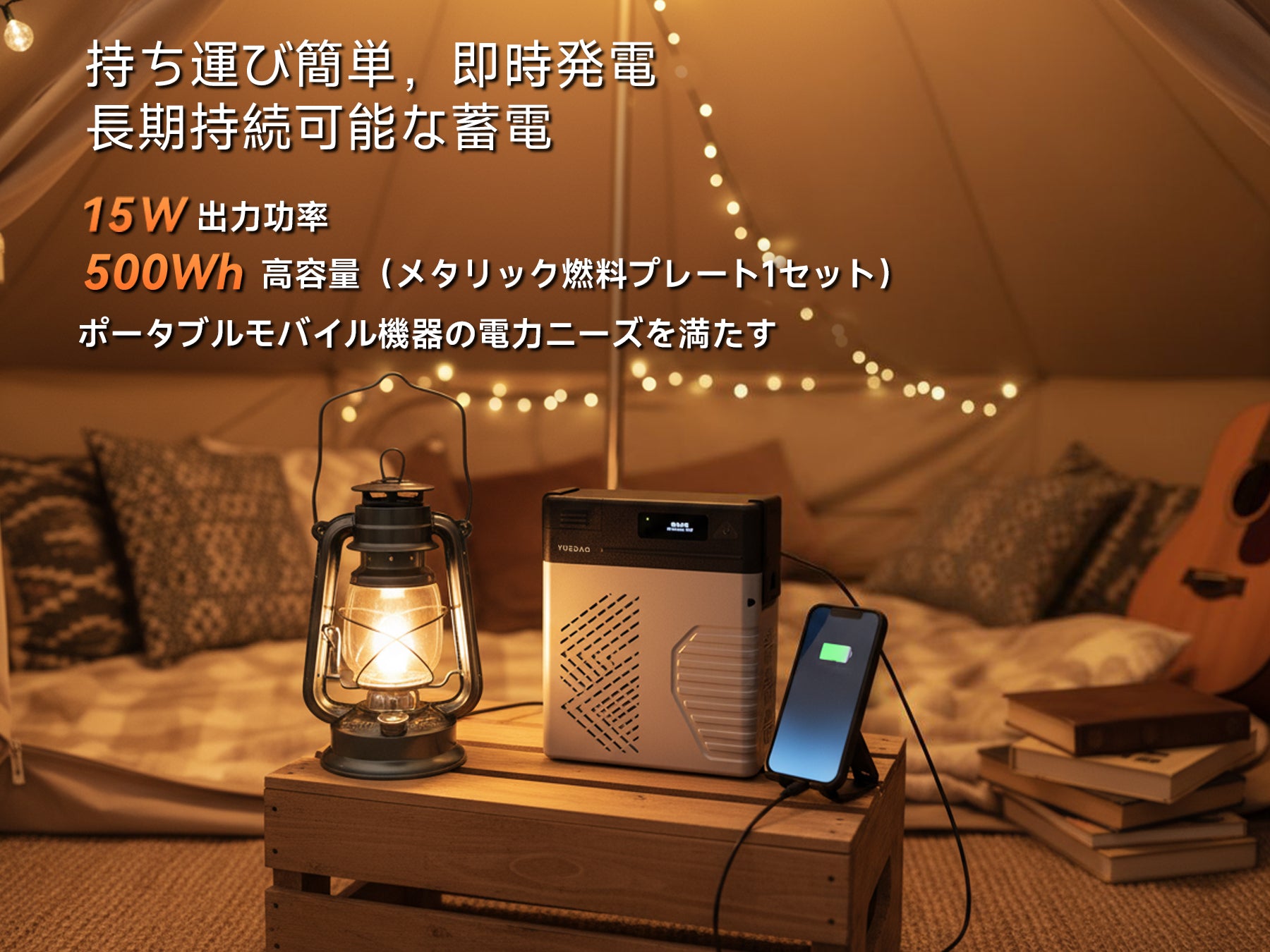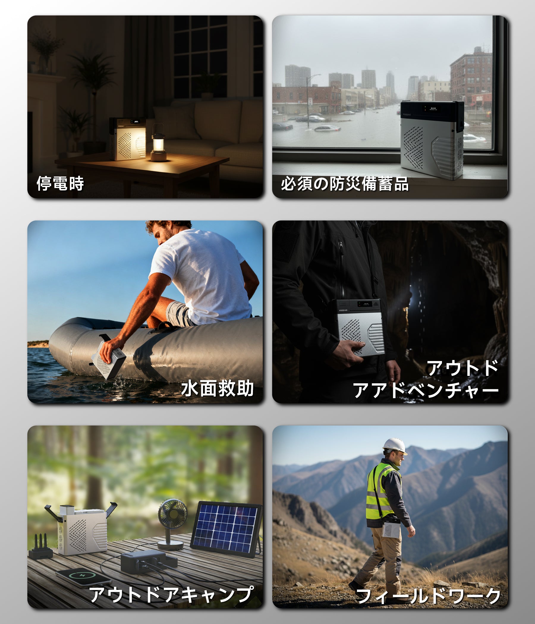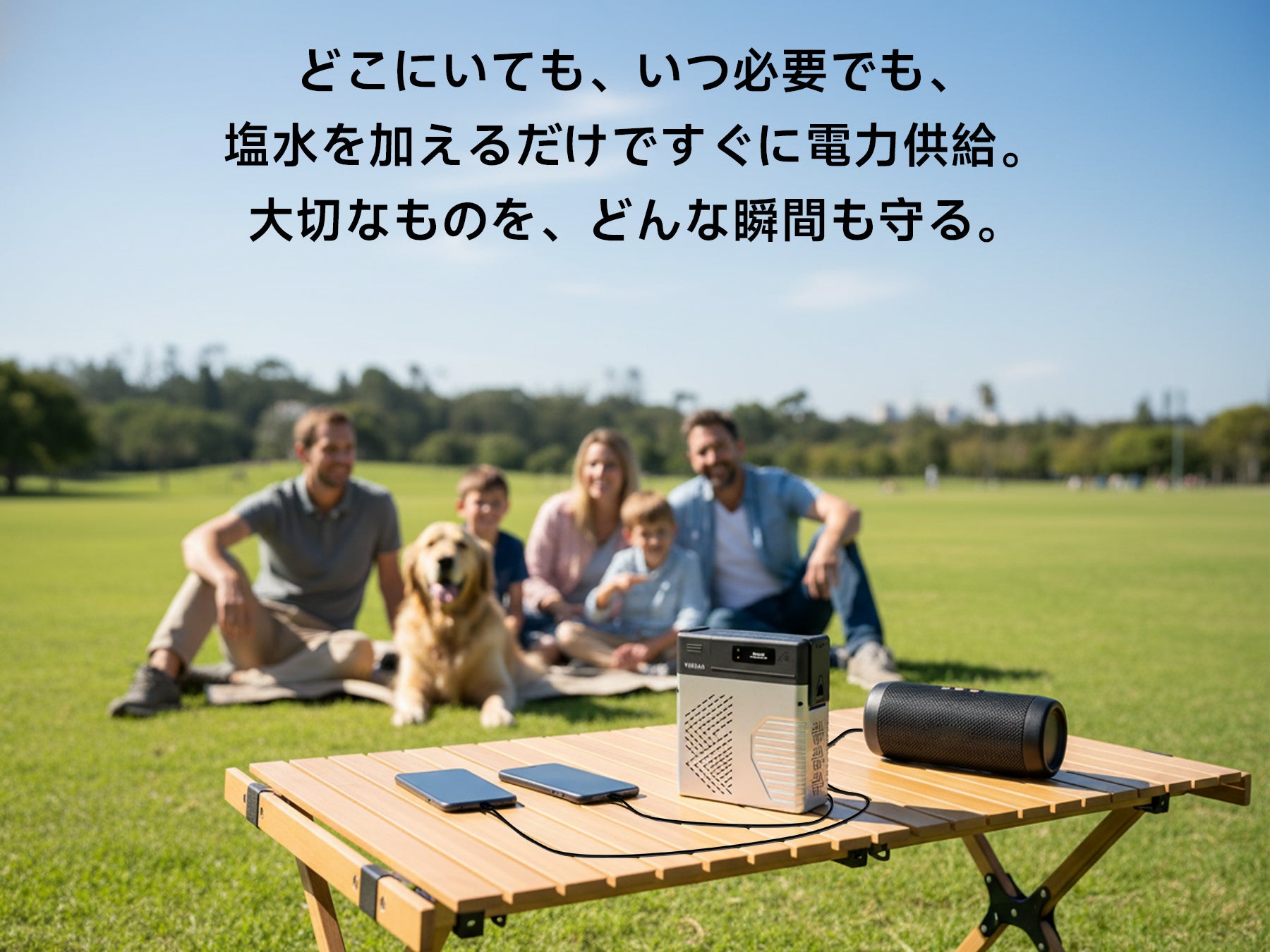 は、様々な緊急事態やオフグリッド環境に対応するために当社が開発した画期的な製品です。食塩水を注ぐだけで即座に電力を供給します。携帯機器に不可欠な安定した出力電力を提供しながら、超軽量で手のひらサイズの設計により、移動中の電力供給を可能にします。非常に広い動作温度範囲完全防水設計を備えており、過酷な環境下でも確実に作動します。たった300gの発電シート1セットで、実に500Whもの大容量の電力を内蔵。数年保存後でも瞬時に発電を開始できます。動作は静粛で、本質安全設計、ユーザーフレンドリーなため、お年寄りやお子様でも簡単に使用できます。この製品が、ご家族の安全を守る、頼りになるエネルギー備えとなることを願っています。