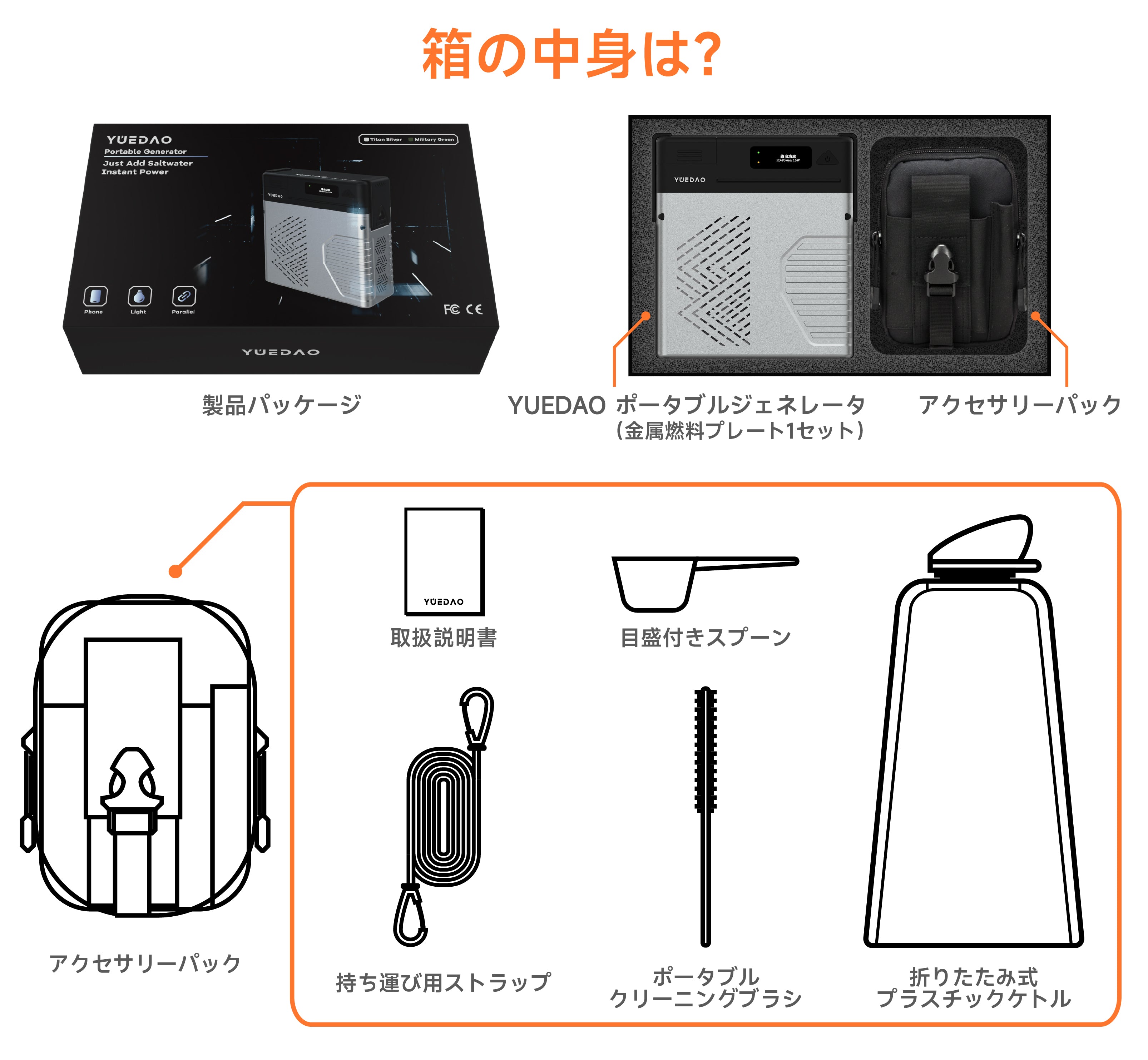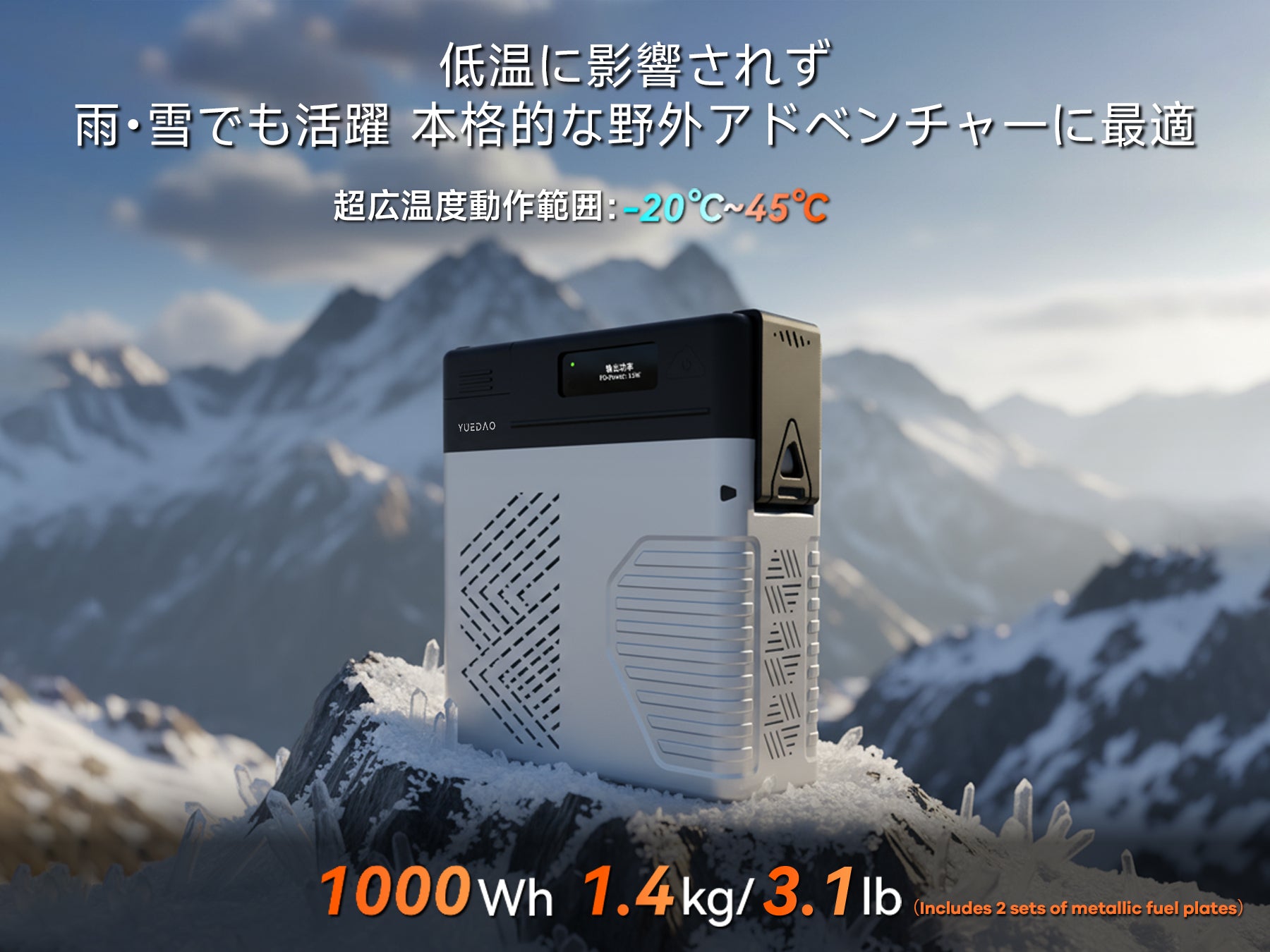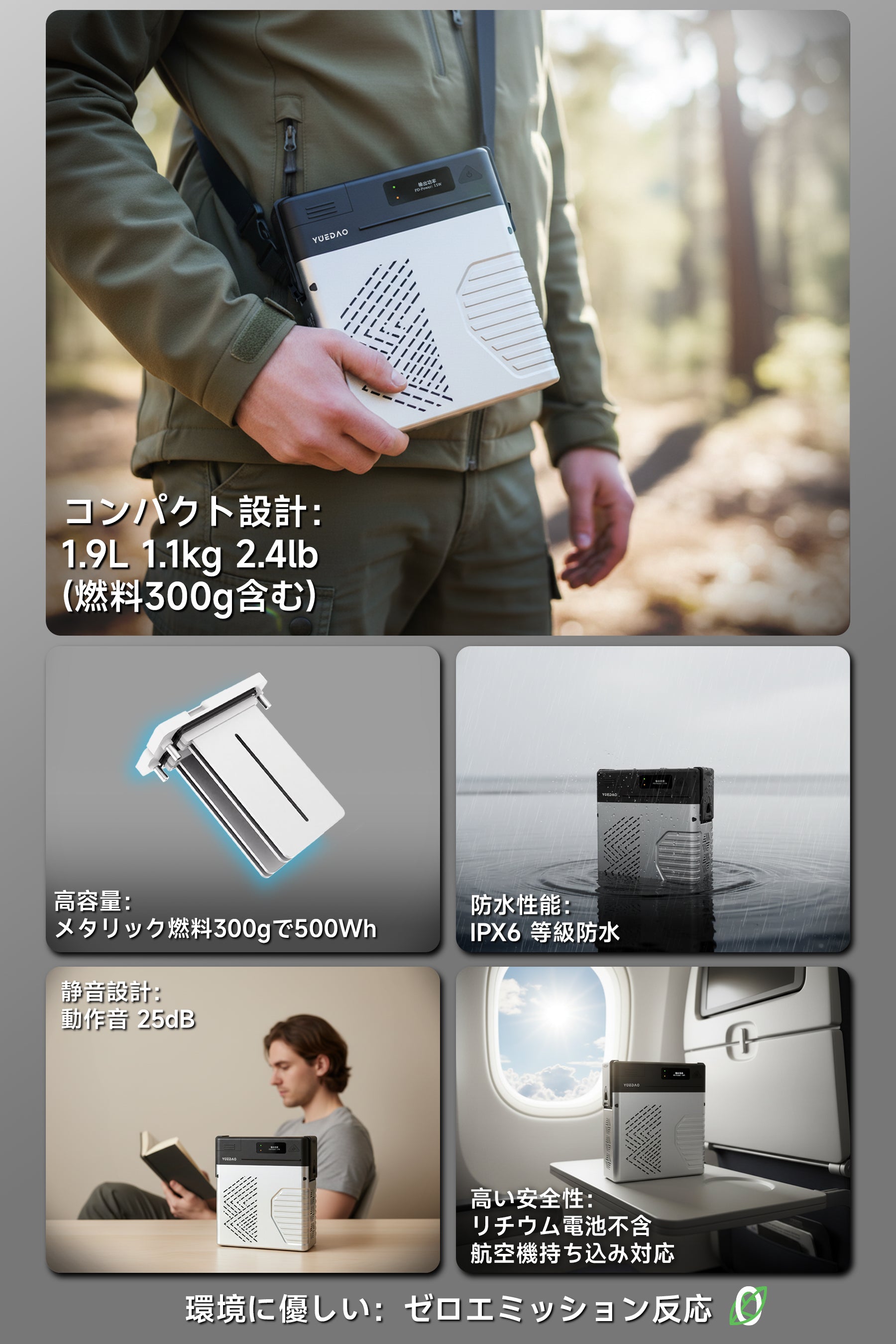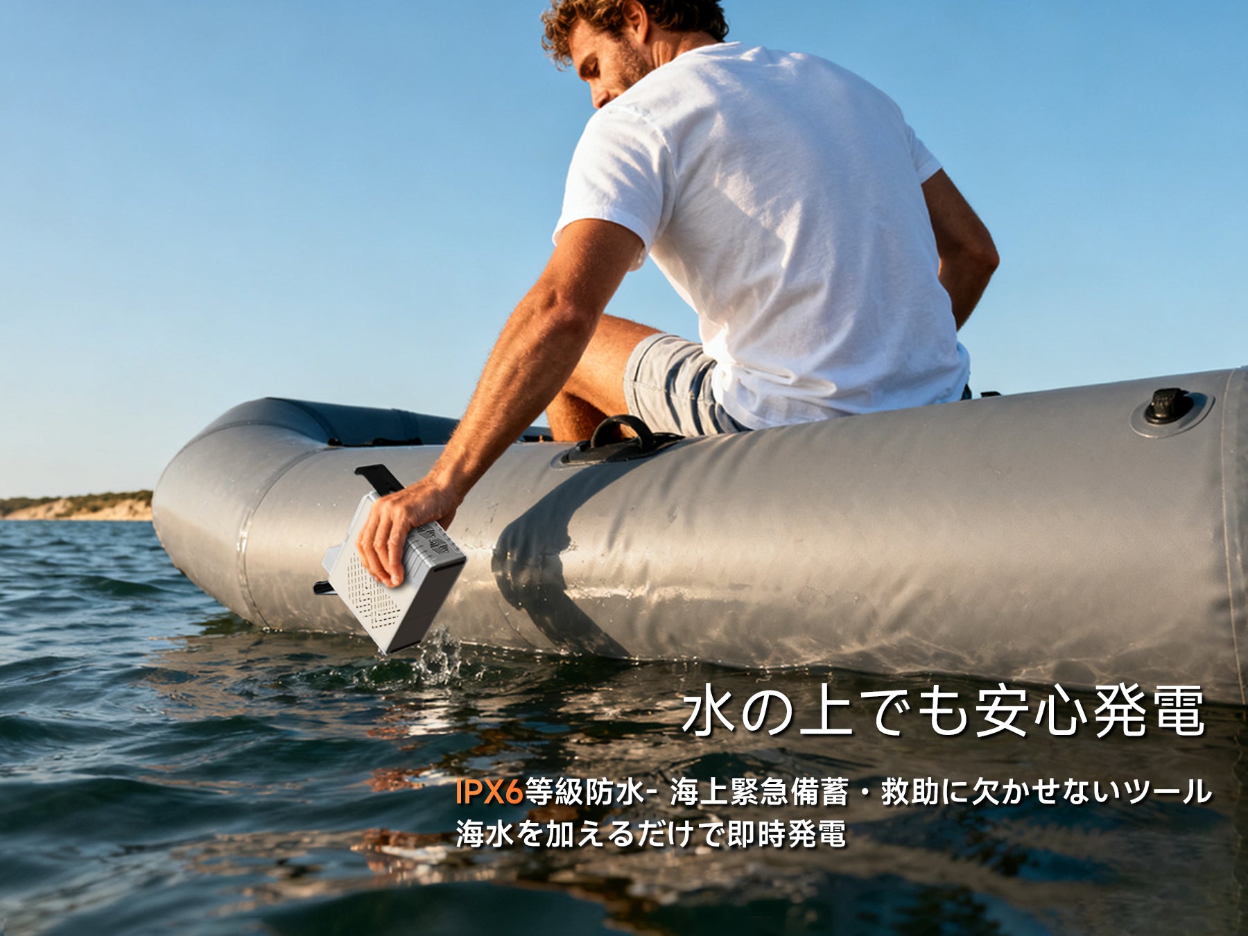 は、様々な緊急事態やオフグリッド環境に対応するために当社が開発した画期的な製品です。食塩水を注ぐだけで即座に電力を供給します。携帯機器に不可欠な安定した出力電力を提供しながら、超軽量で手のひらサイズの設計により、移動中の電力供給を可能にします。非常に広い動作温度範囲完全防水設計を備えており、過酷な環境下でも確実に作動します。たった300gの発電シート1セットで、実に500Whもの大容量の電力を内蔵。数年保存後でも瞬時に発電を開始できます。動作は静粛で、本質安全設計、ユーザーフレンドリーなため、お年寄りやお子様でも簡単に使用できます。この製品が、ご家族の安全を守る、頼りになるエネルギー備えとなることを願っています。