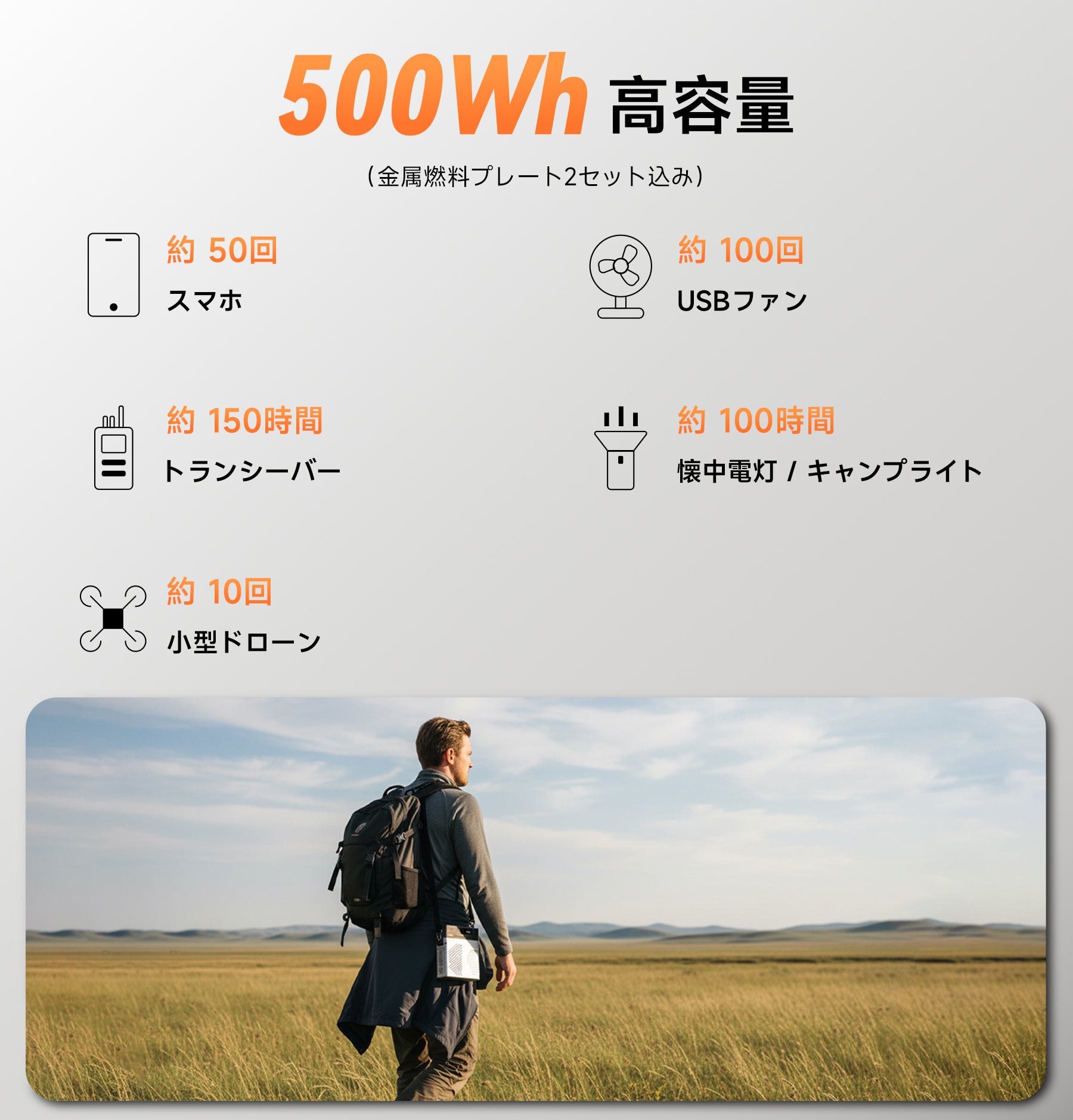 本製品は金属燃料板(メタリック・フューエル・プレート)により発電し(実質無制限の電力供給を実現)、500Wh分の金属燃料板セットを1つ標準装備しています。追加の電力が必要な場合、別途金属燃料板を購入・携行可能です。各セットの重量はわずか300gでありながら、500Whの大容量エネルギーを内蔵しています。