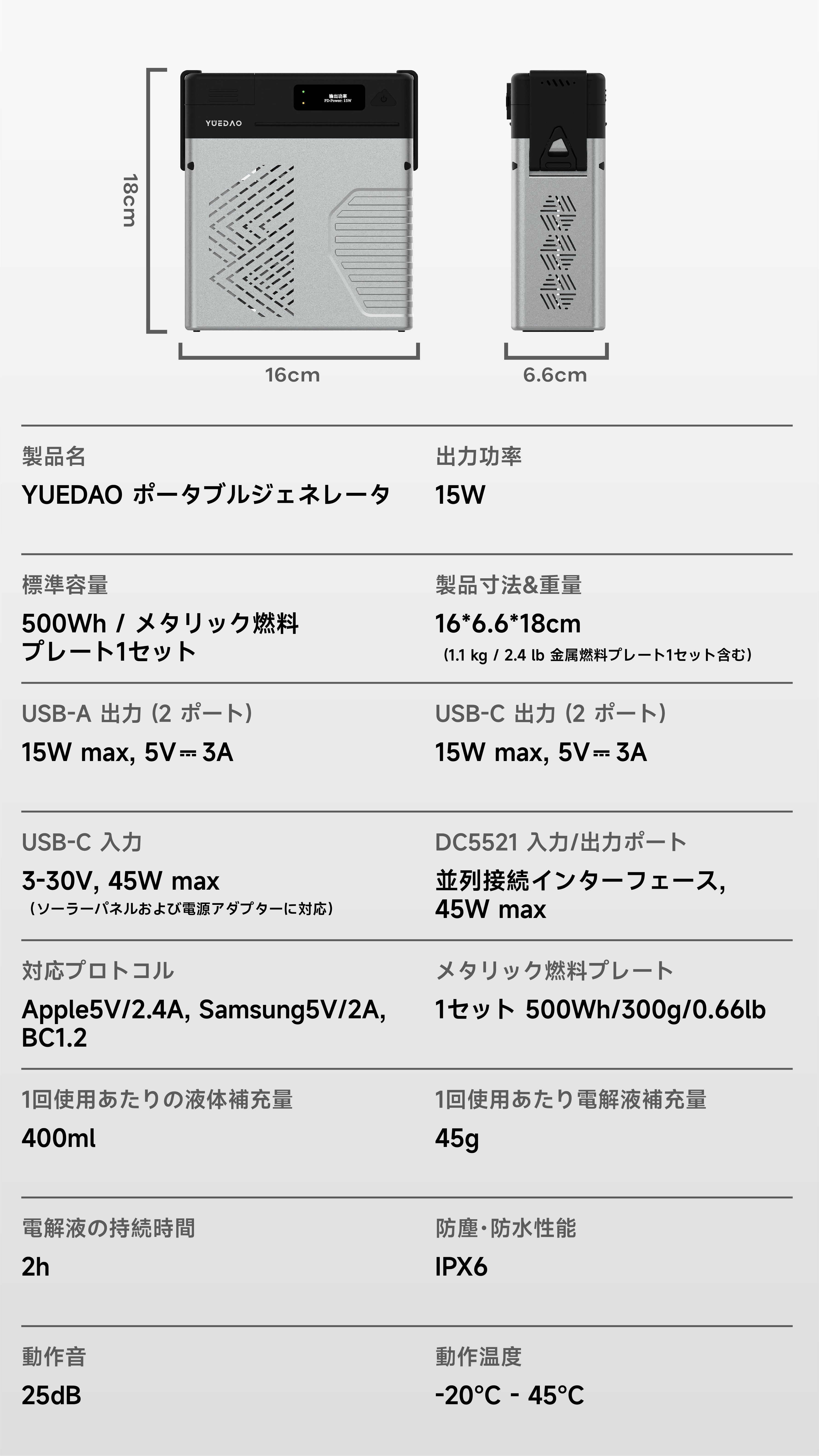YUEDAO ポータブル発電機 500Wh / IPX6防水 / DC5V出力 / 15W出力 / 航空機持ち込み可能 / 非リチウム電池(予約販売中)